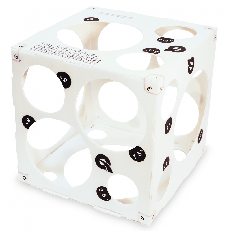 Sizerul este in forma de cub si permite umflarea baloanelor la 17 dimensiuni diferite.