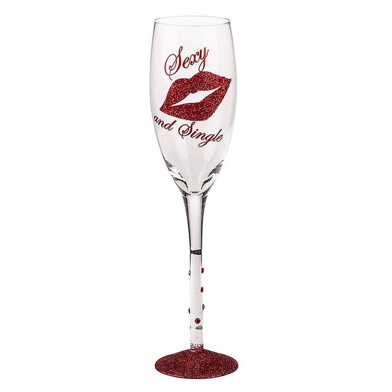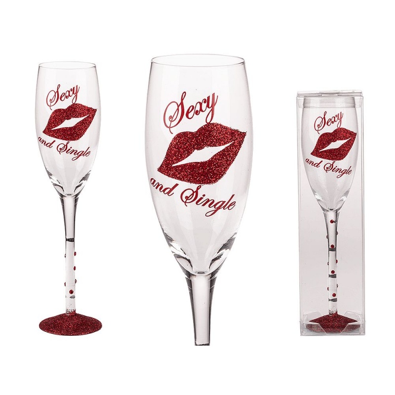 Pahar sampanie "Sexy and single" decorat cu sclipici si pietricele. Vine ambalat in cutie PVC.