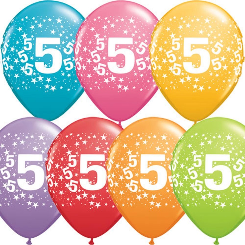 Baloane latex inscriptionate cu varsta copilului - 5 ani. Setul contine baloane multicolore inscriptionate cu cifra, stelute, coifuri si lumanari.