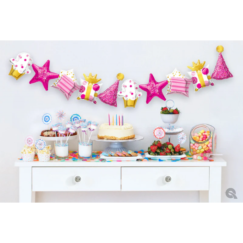 Ghirlanda decorativa este un element de decor foarte vesel si colorat, ideal pentru orice petrecere aniversara sau tematica.