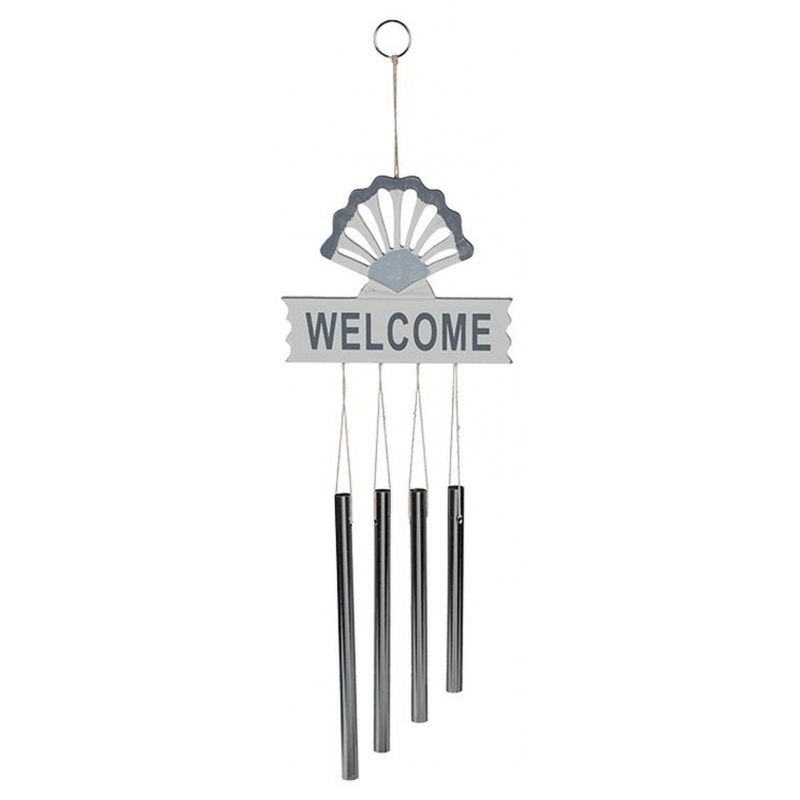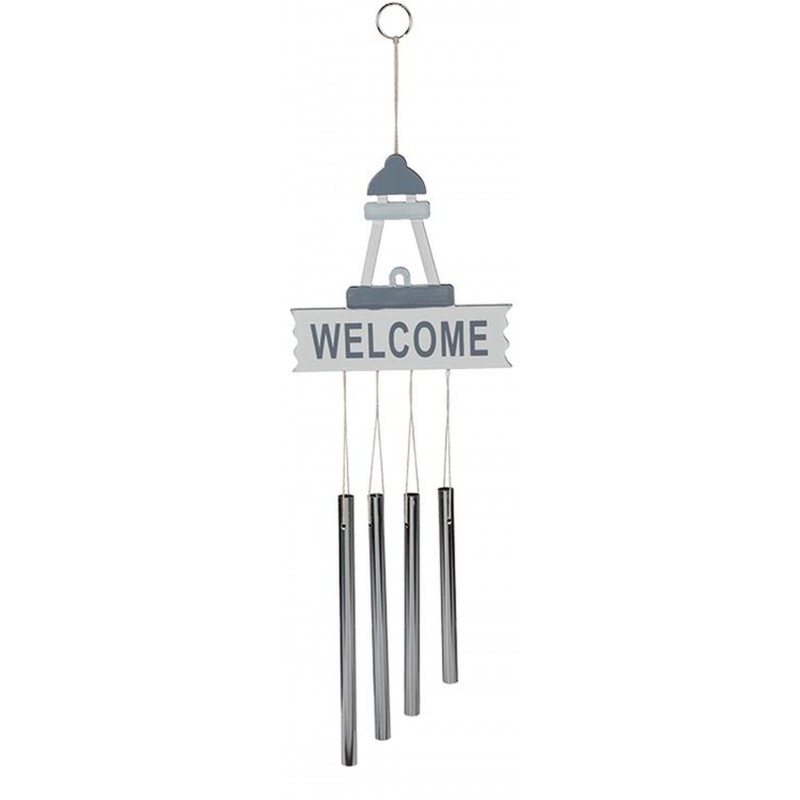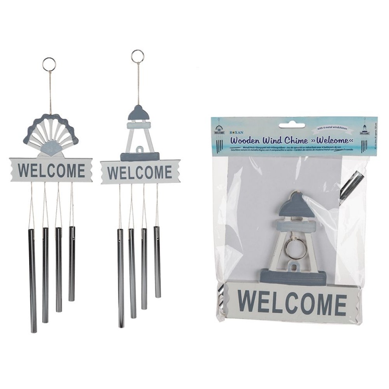 Clopotei de vant din lemn cu 4 tubi metalice si cu mesajul "Welcome".