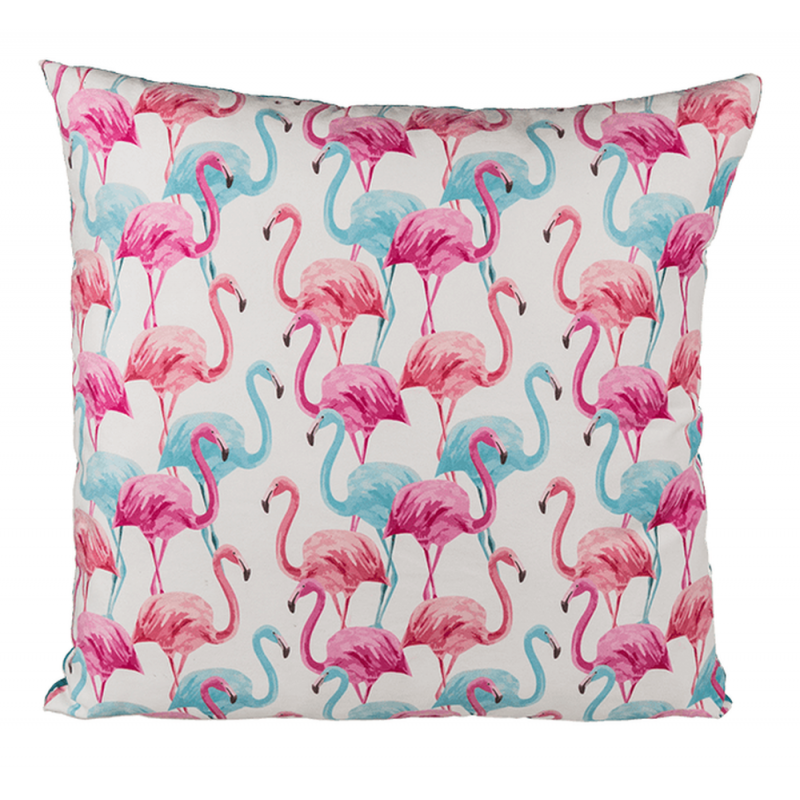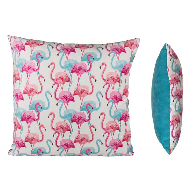 Perna este imprimata cu pasari Flamingo si are dimensiunea de 40 x 40 cm. Este confectionata din poliester, iar greutatea umpluturii este de 280 gr.