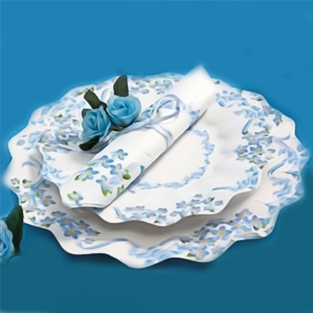 Set 10 farfurii 27 cm, flori bleu, 62939 Material: carton plastifiat de calitate superioara, material eco, biodegradabil. Recomandate pentru: petereceri, botezuri, nunti, etc.