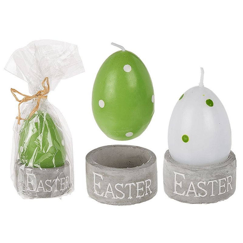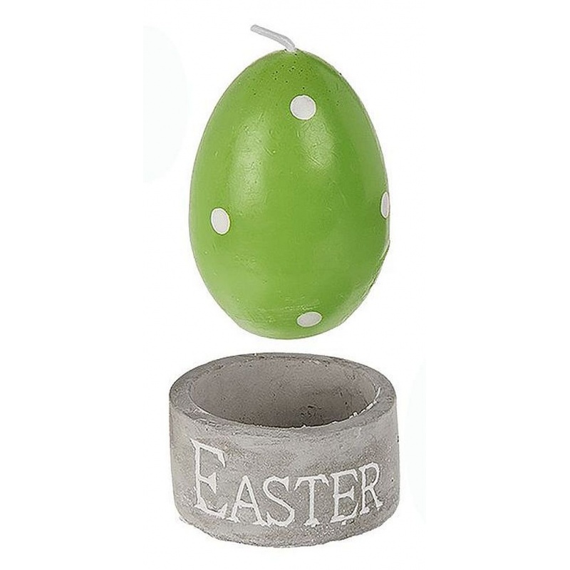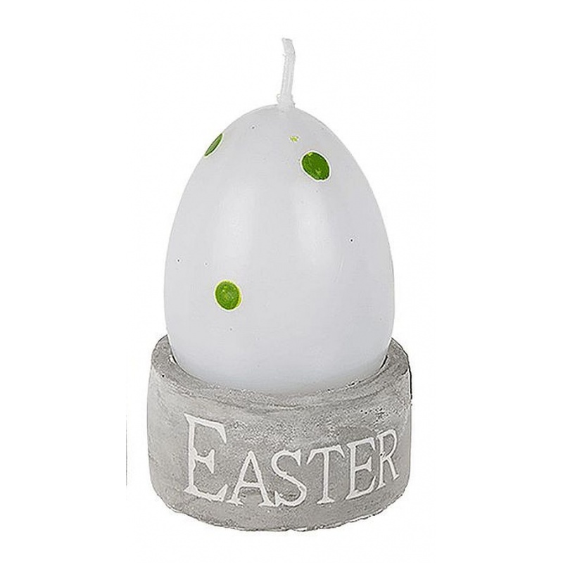 Lumanare decorativa de Paste in forma de ou cu suport. Vine in doua culori alba cu bulinute verzi si verde cu bulinute albe.